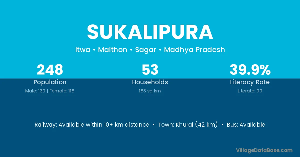 Khurai (42 km) is the nearest town to Sukalipura village for major economic activities and is located approximately 42 km away.