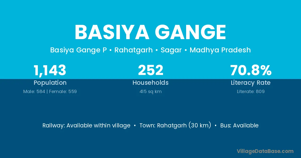 Rahatgarh (30 km) is the nearest town to Basiya Gange village for major economic activities and is located approximately 30 km away.