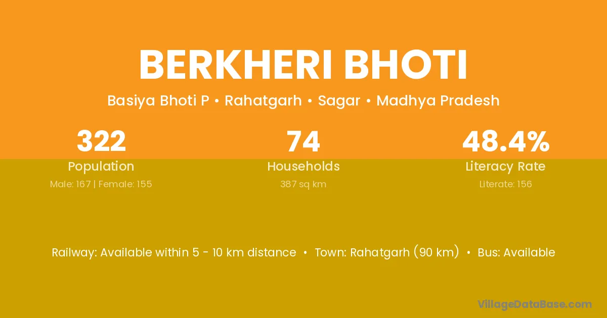 Rahatgarh (90 km) is the nearest town to Berkheri Bhoti village for major economic activities and is located approximately 90 km away.