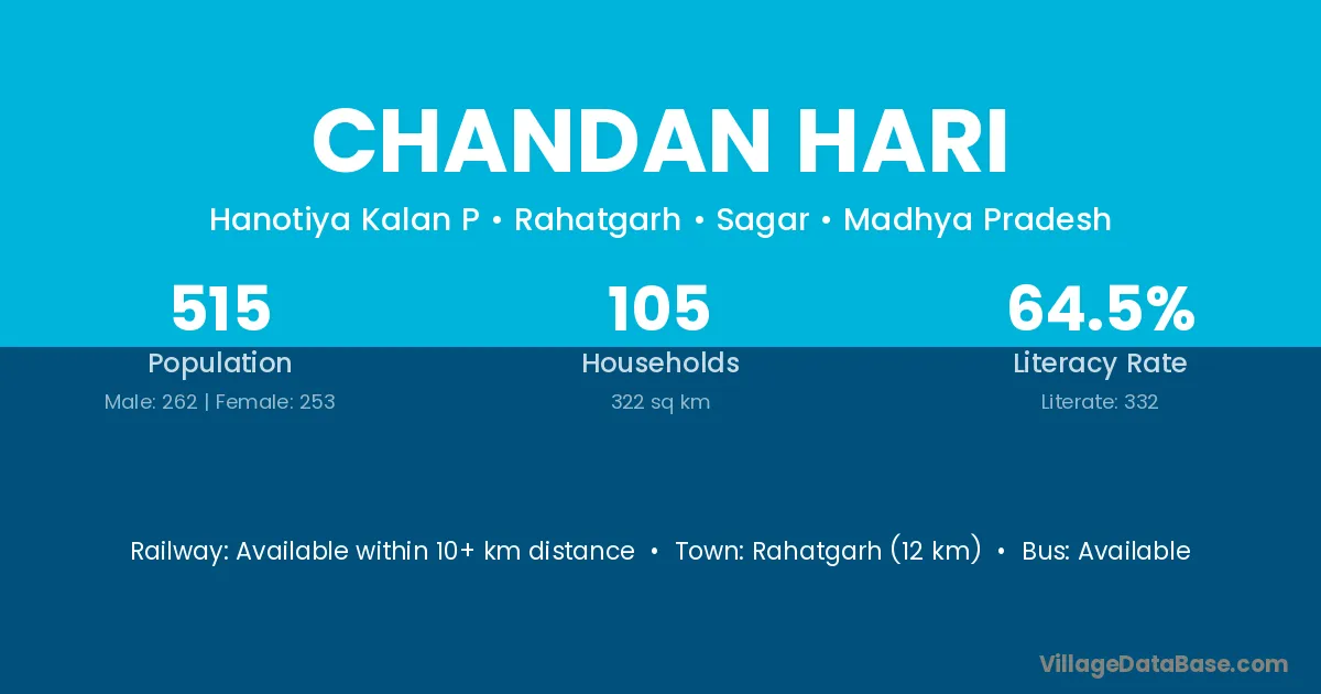 Rahatgarh (12 km) is the nearest town to Chandan Hari village for major economic activities and is located approximately 12 km away.