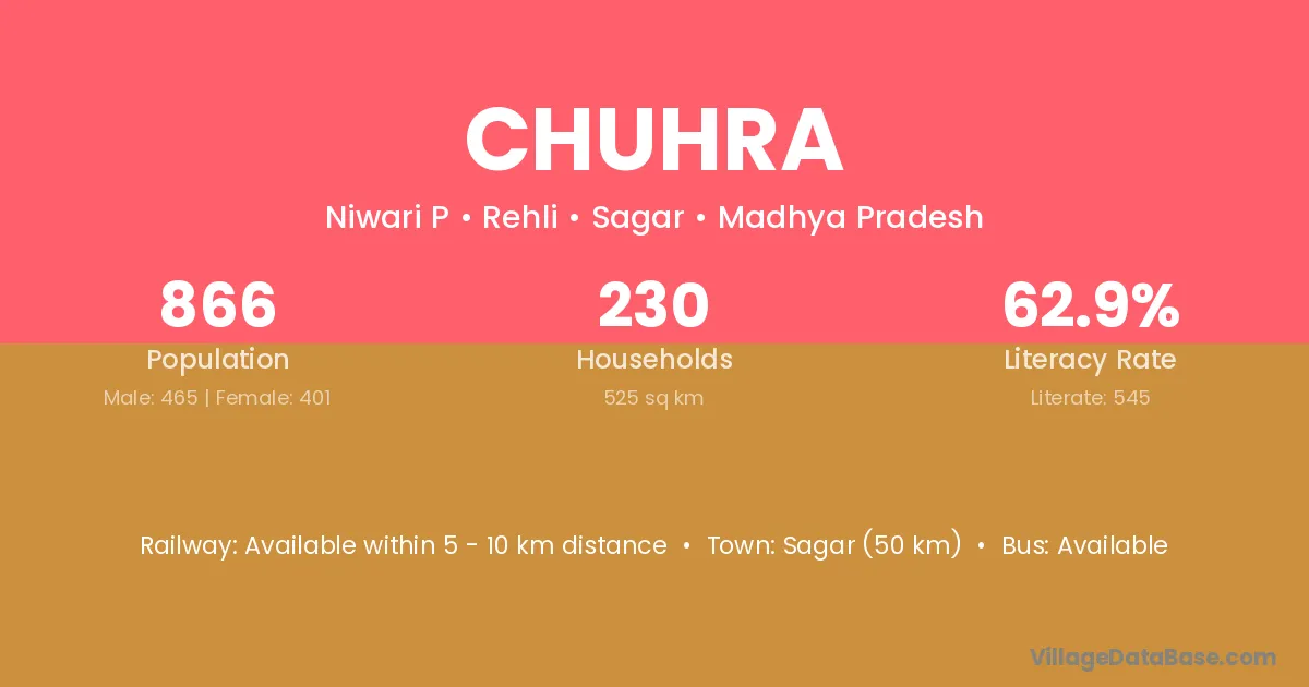 Sagar (50 km) is the nearest town to Chuhra village for major economic activities and is located approximately 50 km away.