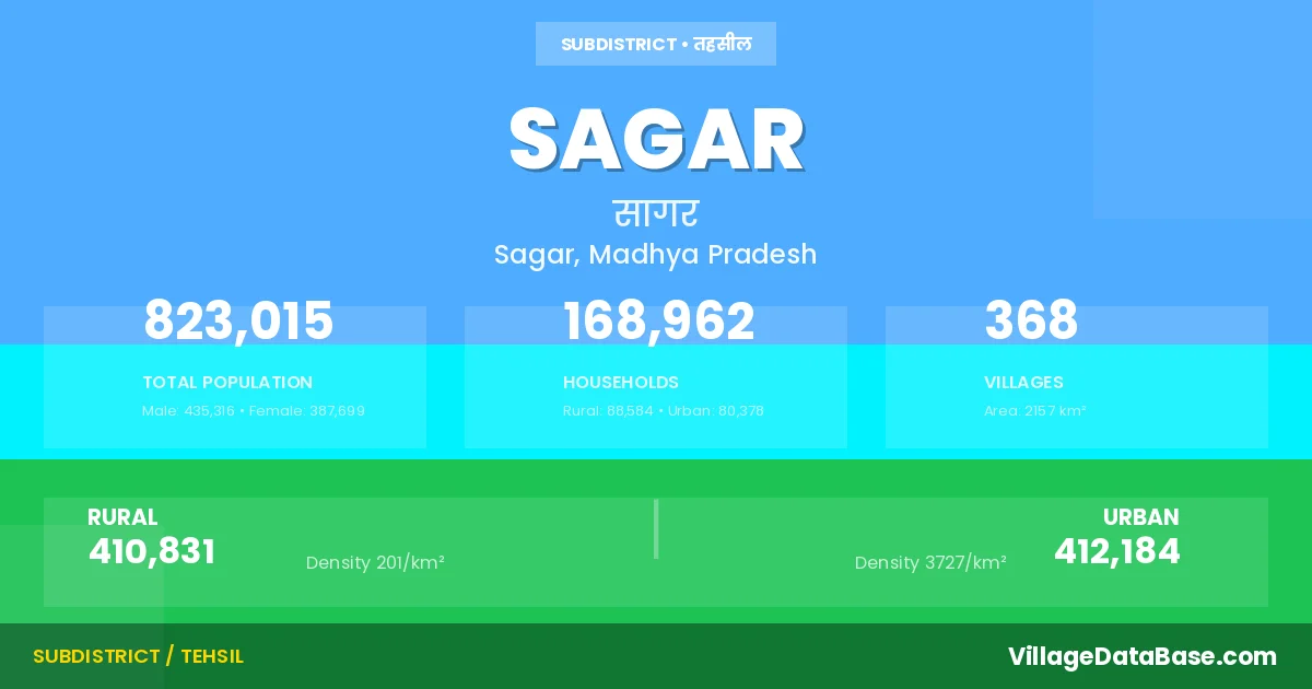 According to the 2011 census The total area of Sagar Tehsil is 2157 km², with a population of 823015 people. The population density is 382 inhabitants per square kilometre, and there are approximately 168962 houses in the sub district.