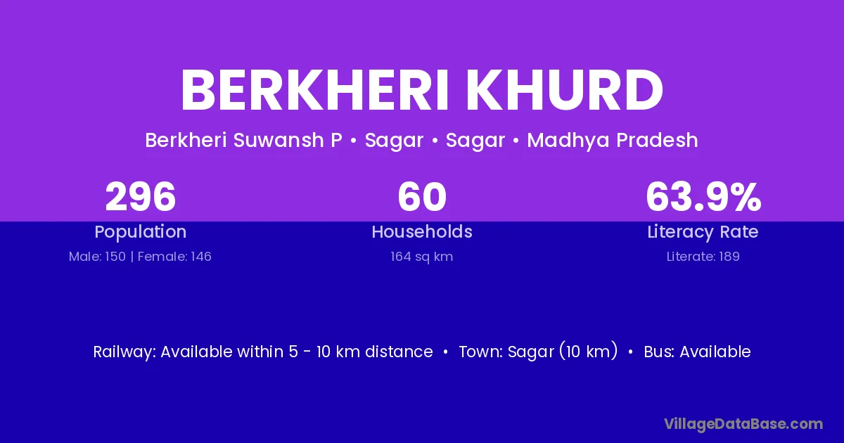 Sagar (10 km) is the nearest town to Berkheri Khurd village for major economic activities and is located approximately 10 km away.