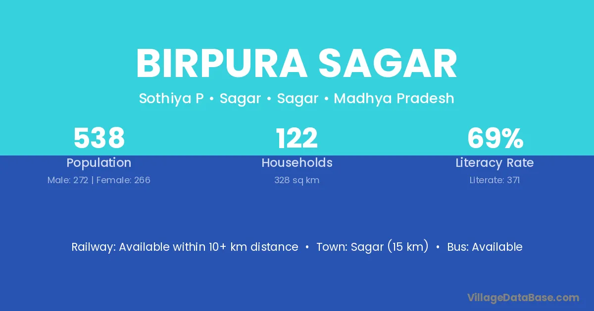 Sagar (15 km) is the nearest town to Birpura Sagar village for major economic activities and is located approximately 15 km away.