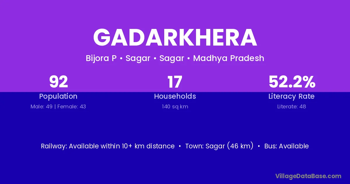 Sagar (46 km) is the nearest town to Gadarkhera village for major economic activities and is located approximately 46 km away.