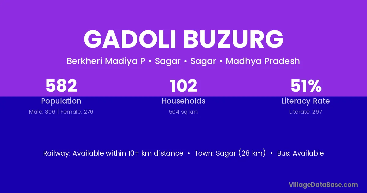 Sagar (28 km) is the nearest town to Gadoli Buzurg village for major economic activities and is located approximately 28 km away.