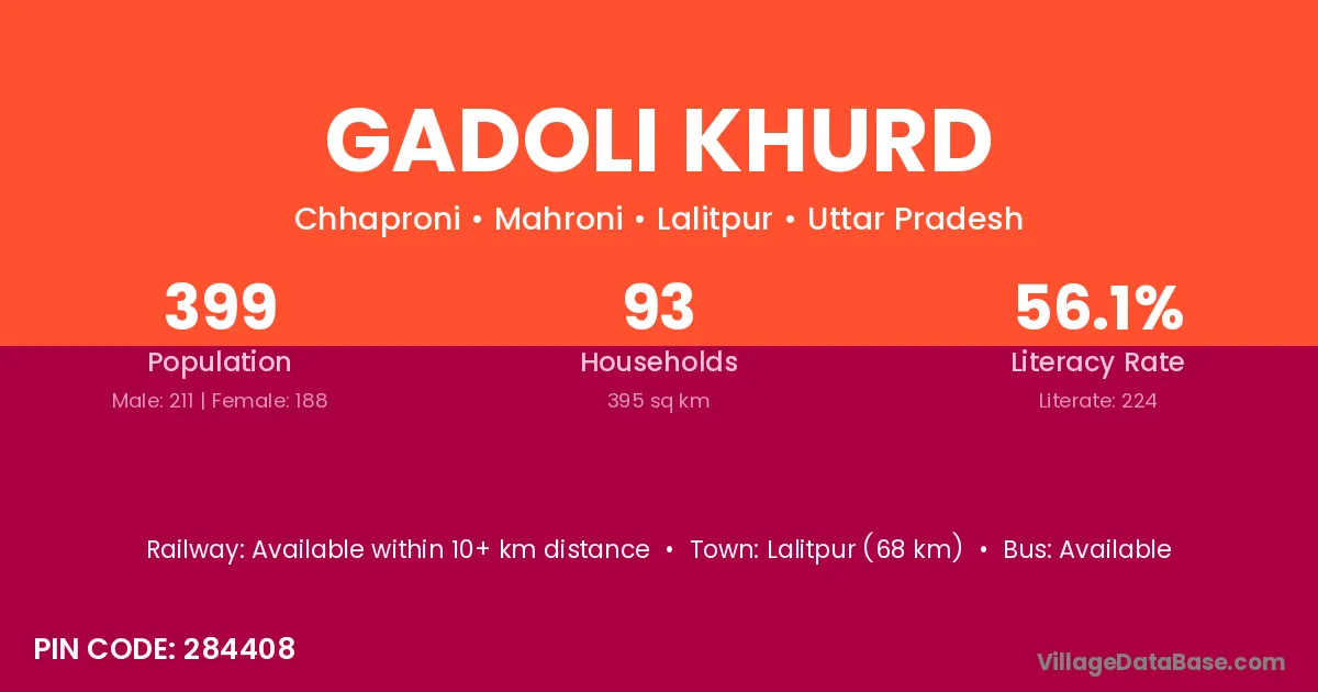 Gadoli Khurd village has a total population of 1,926 people, of which 1,026 are males and 900 are females.