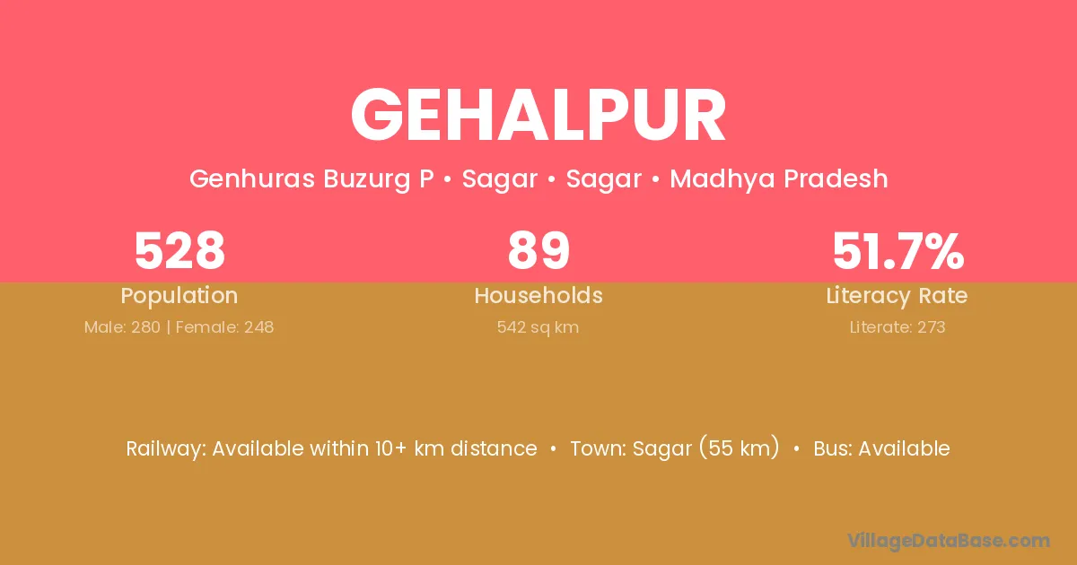 Sagar (55 km) is the nearest town to Gehalpur village for major economic activities and is located approximately 55 km away.