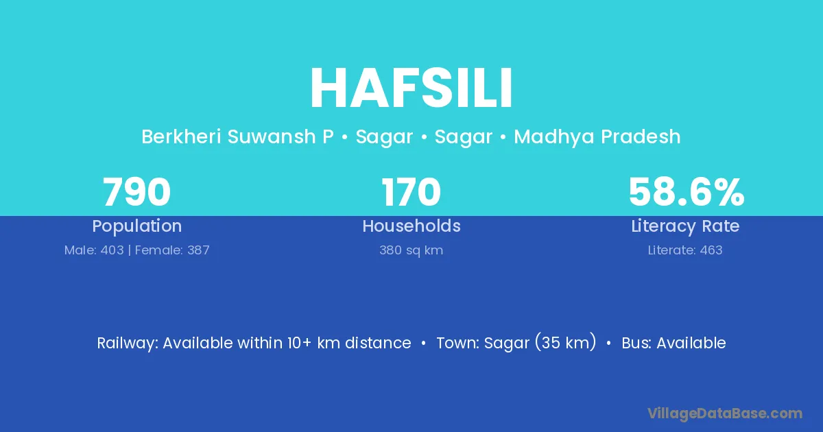 Sagar (35 km) is the nearest town to Hafsili village for major economic activities and is located approximately 35 km away.