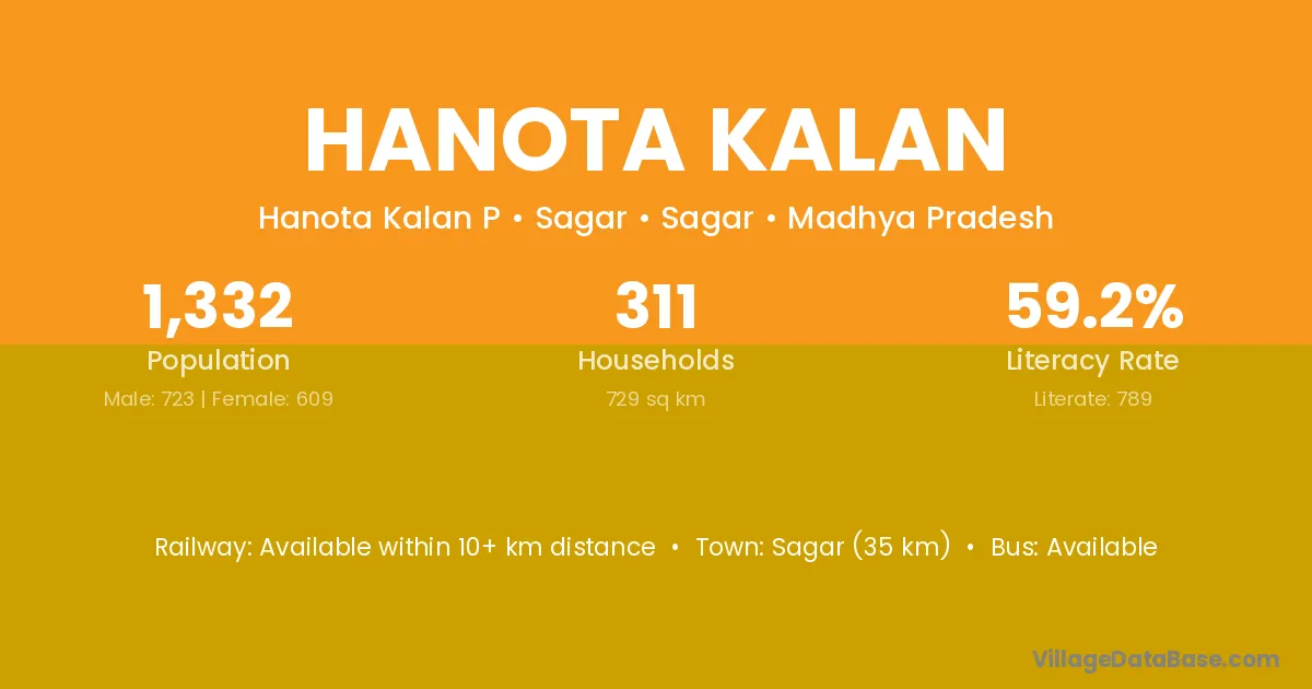 Sagar (35 km) is the nearest town to Hanota Kalan village for major economic activities and is located approximately 35 km away.