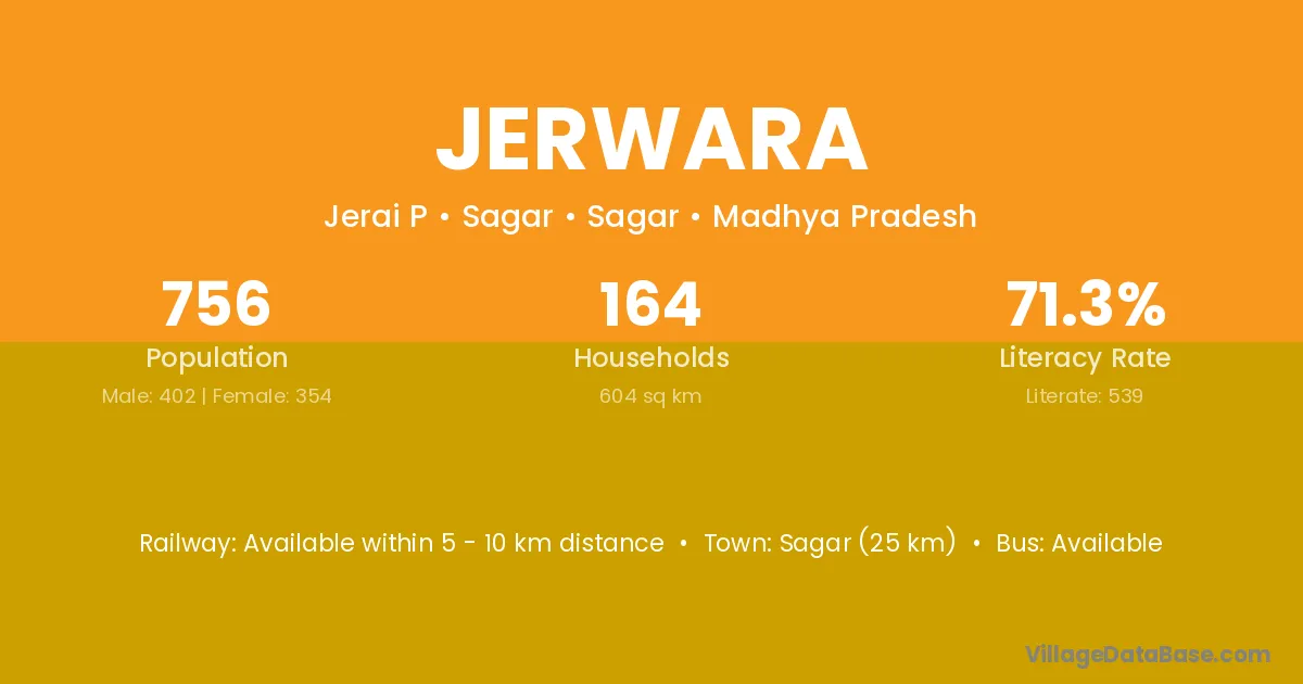 Sagar (25 km) is the nearest town to Jerwara village for major economic activities and is located approximately 25 km away.