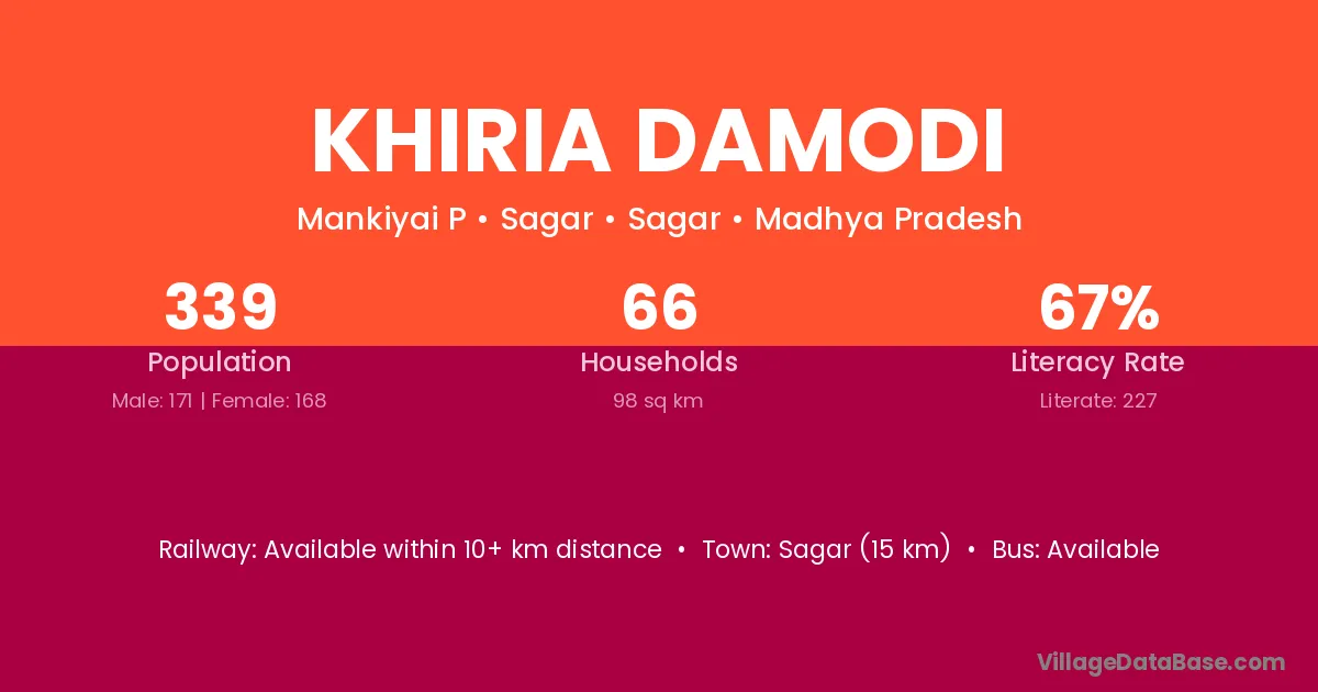 Sagar (15 km) is the nearest town to Khiria Damodi village for major economic activities and is located approximately 15 km away.