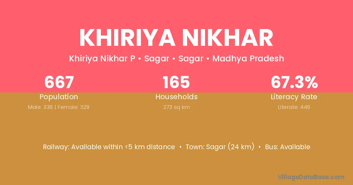 Sagar (24 km) is the nearest town to Khiriya Nikhar village for major economic activities and is located approximately 24 km away.