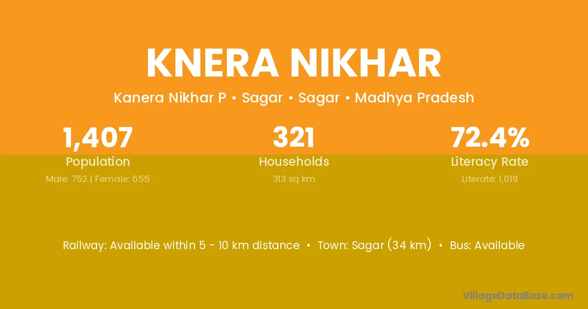 Sagar (34 km) is the nearest town to Knera Nikhar village for major economic activities and is located approximately 34 km away.