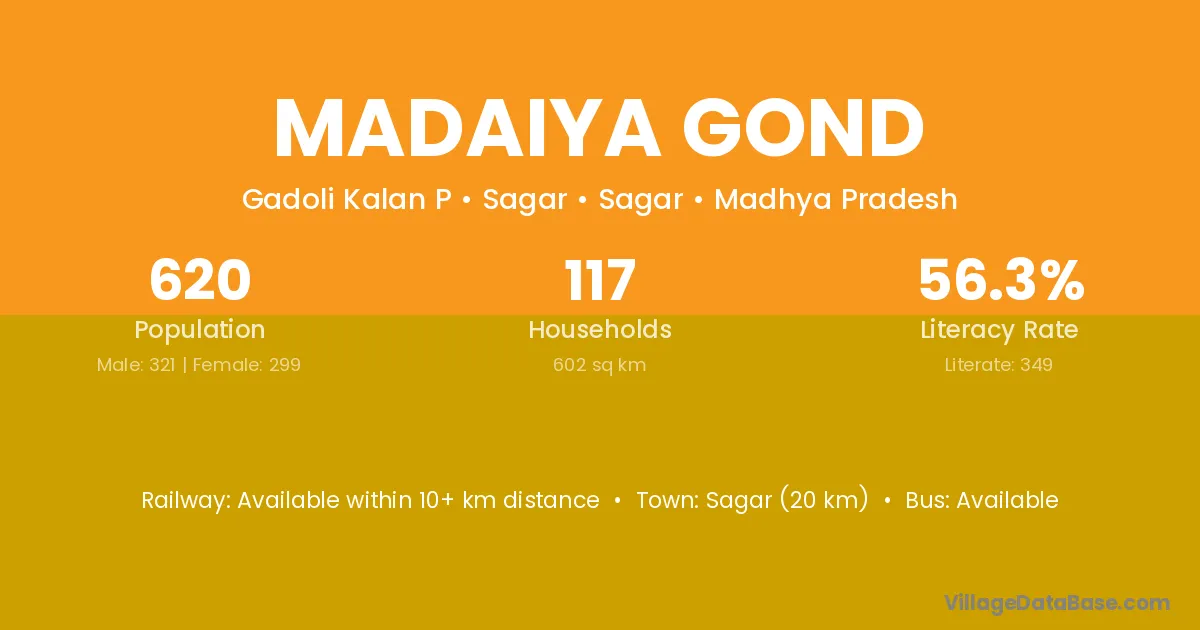 Sagar (20 km) is the nearest town to Madaiya Gond village for major economic activities and is located approximately 20 km away.