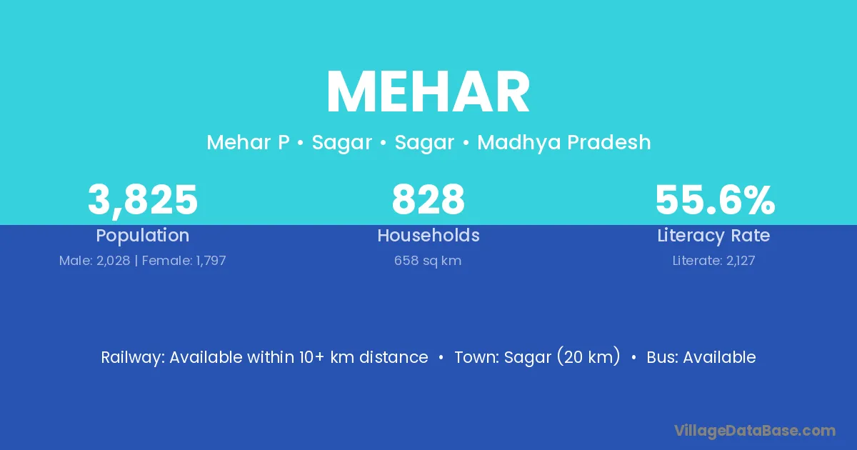 Sagar (20 km) is the nearest town to Mehar village for major economic activities and is located approximately 20 km away.