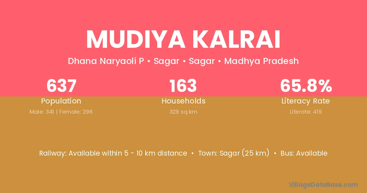 Sagar (25 km) is the nearest town to Mudiya Kalrai village for major economic activities and is located approximately 25 km away.