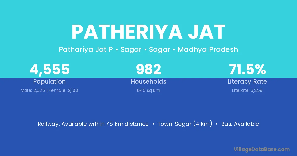 Sagar (4 km) is the nearest town to Patheriya Jat village for major economic activities and is located approximately 4 km away.