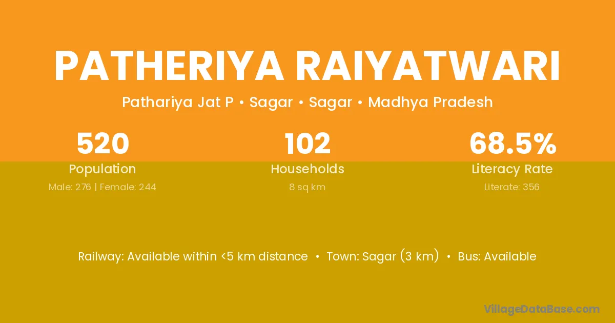 Sagar (3 km) is the nearest town to Patheriya Raiyatwari village for major economic activities and is located approximately 3 km away.
