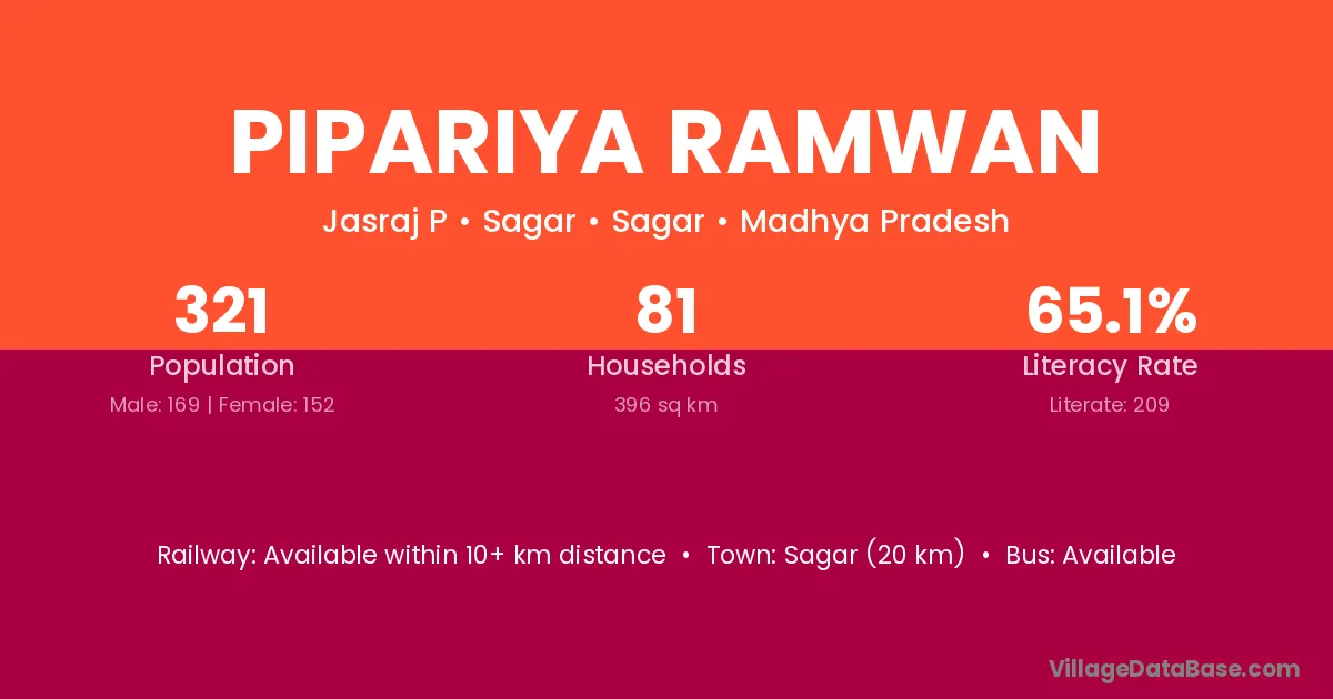 Sagar (20 km) is the nearest town to Pipariya Ramwan village for major economic activities and is located approximately 20 km away.