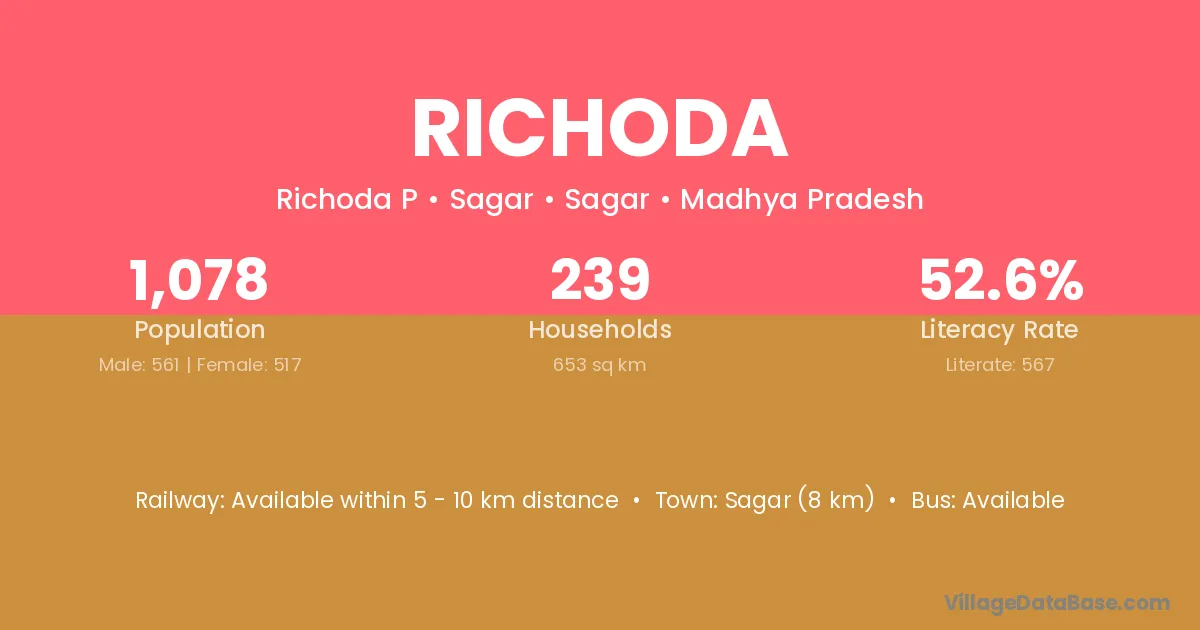 Sagar (8 km) is the nearest town to Richoda village for major economic activities and is located approximately 8 km away.