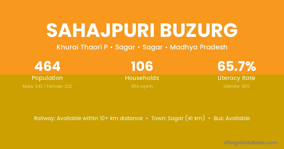 Sagar (41 km) is the nearest town to Sahajpuri Buzurg village for major economic activities and is located approximately 41 km away.
