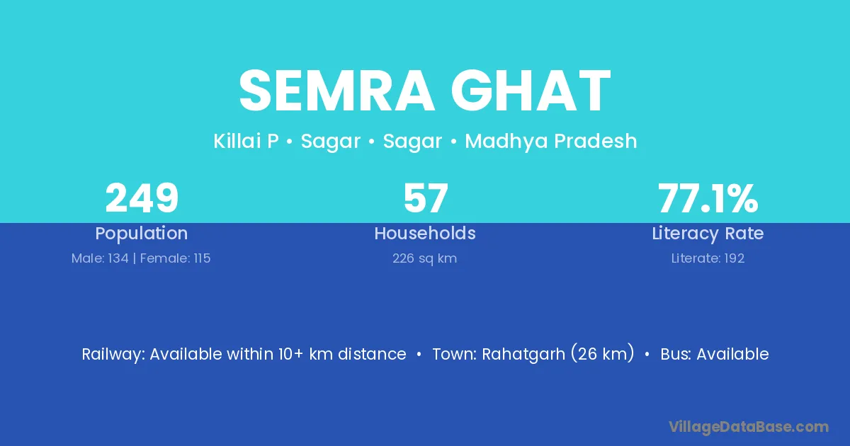 Rahatgarh (26 km) is the nearest town to Semra Ghat village for major economic activities and is located approximately 26 km away.