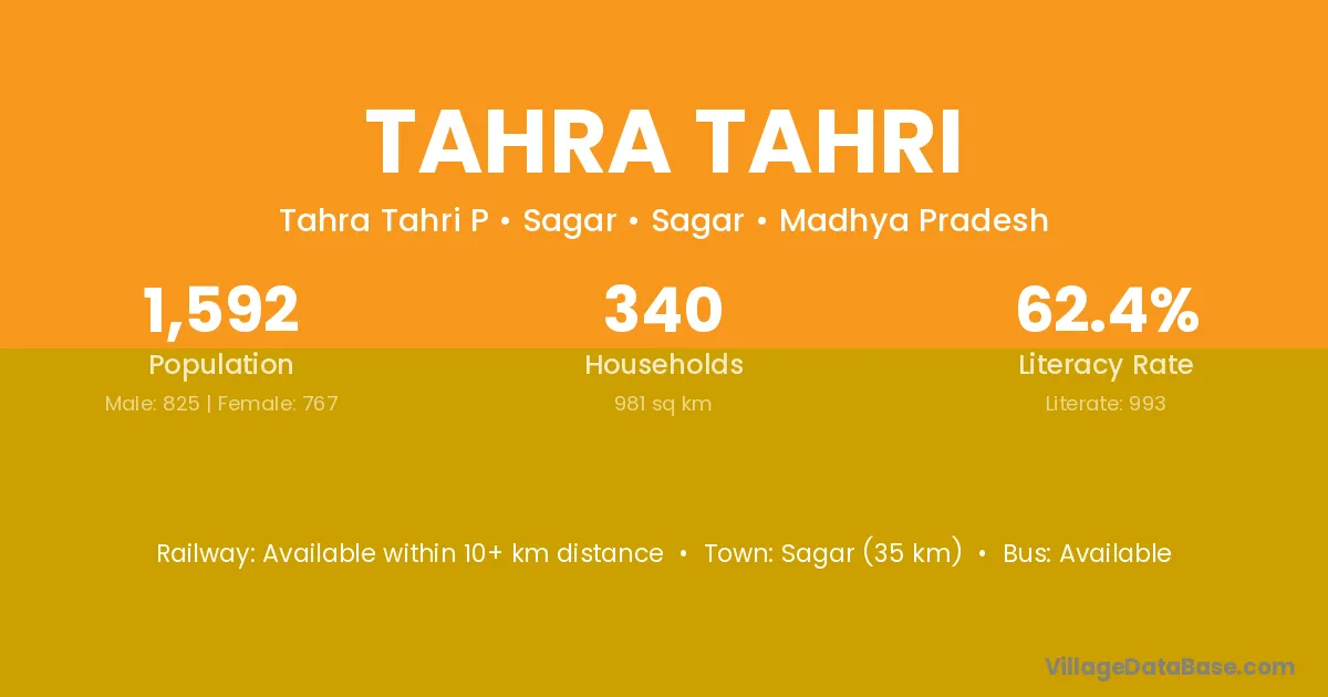Sagar (35 km) is the nearest town to Tahra Tahri village for major economic activities and is located approximately 35 km away.