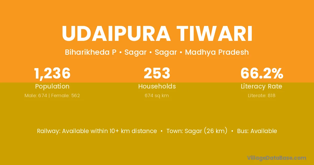 Sagar (26 km) is the nearest town to Udaipura Tiwari village for major economic activities and is located approximately 26 km away.