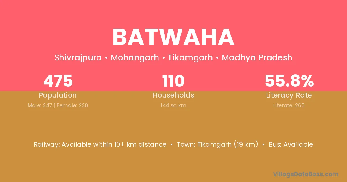 Shahgarh (6 km) is the nearest town to Batwaha village for major economic activities and is located approximately 6 km away.