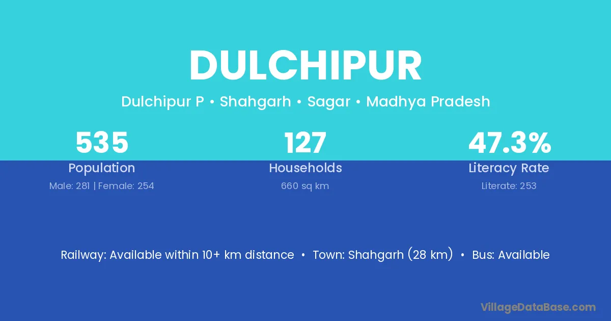 Shahgarh (28 km) is the nearest town to Dulchipur village for major economic activities and is located approximately 28 km away.