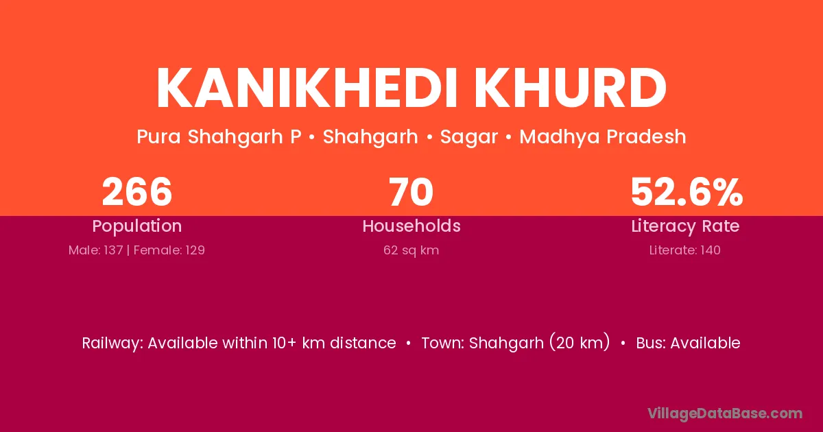 Shahgarh (20 km) is the nearest town to Kanikhedi Khurd village for major economic activities and is located approximately 20 km away.