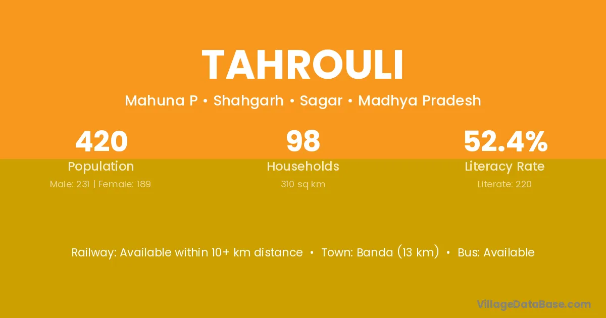 Banda (13 km) is the nearest town to Tahrouli village for major economic activities and is located approximately 13 km away.