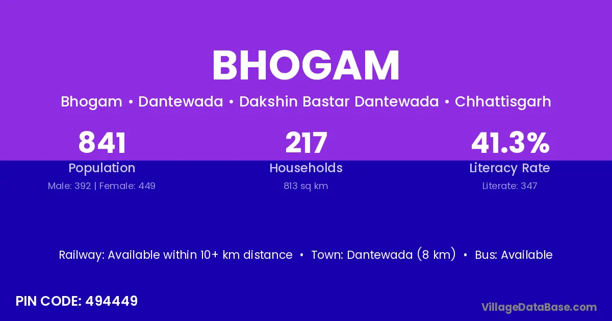 Bhogam village has a total population of 131 people, of which 66 are males and 65 are females.