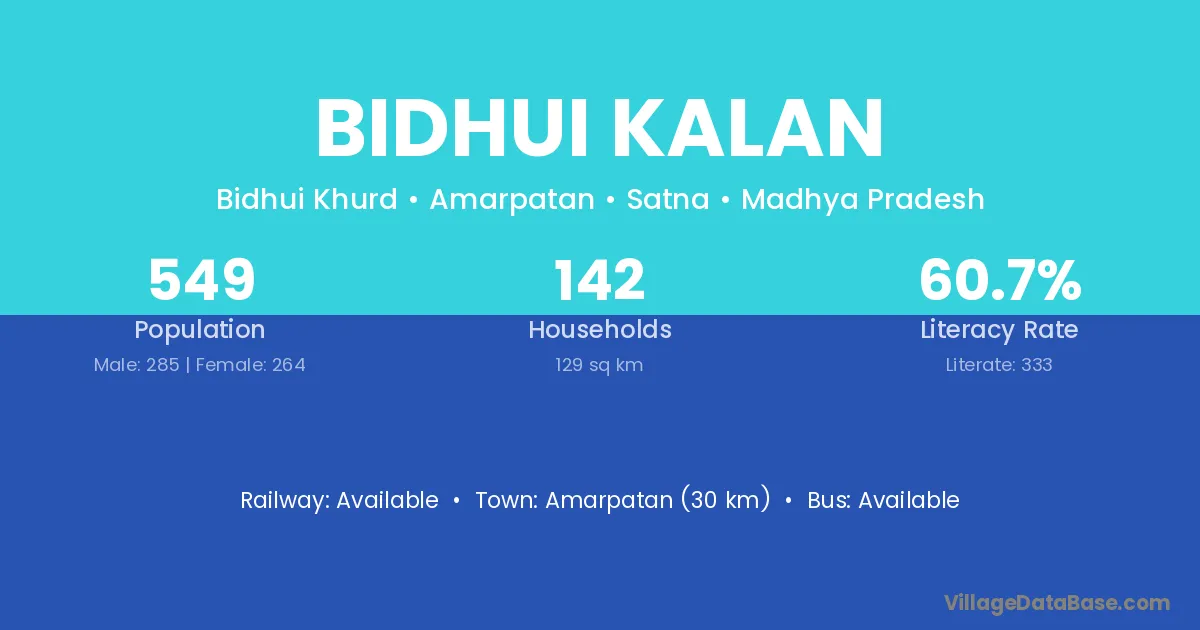 Amarpatan (30 km) is the nearest town to Bidhui Kalan village for major economic activities and is located approximately 30 km away.