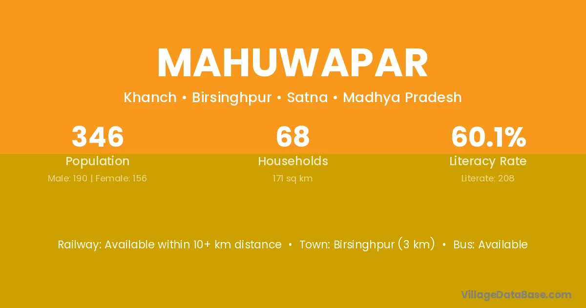 Birsinghpur (3 km) is the nearest town to Mahuwapar village for major economic activities and is located approximately 3 km away.