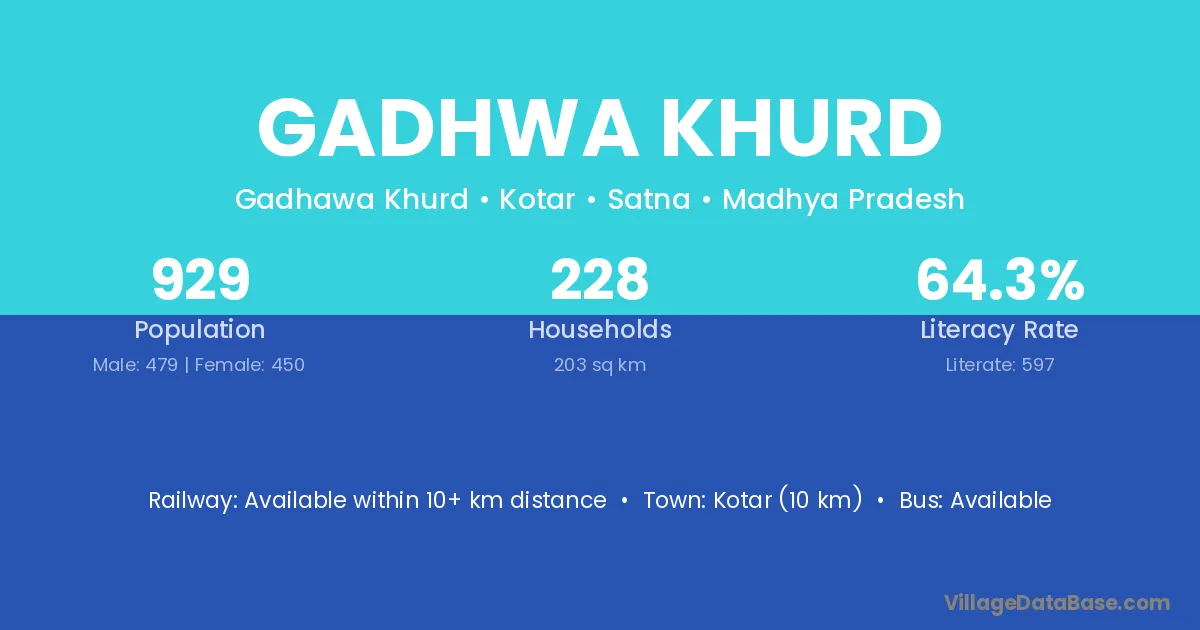 Gadhwa Khurd village has a total population of 929 people, of which 479 are males and 450 are females.