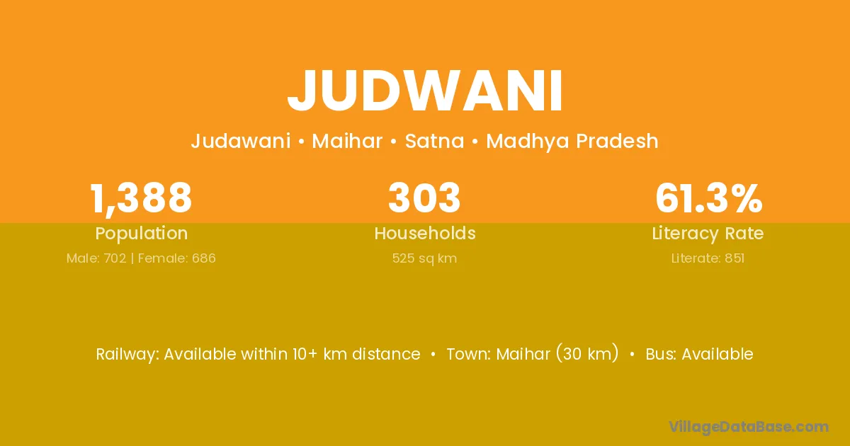 Maihar (30 km) is the nearest town to Judwani village for major economic activities and is located approximately 30 km away.