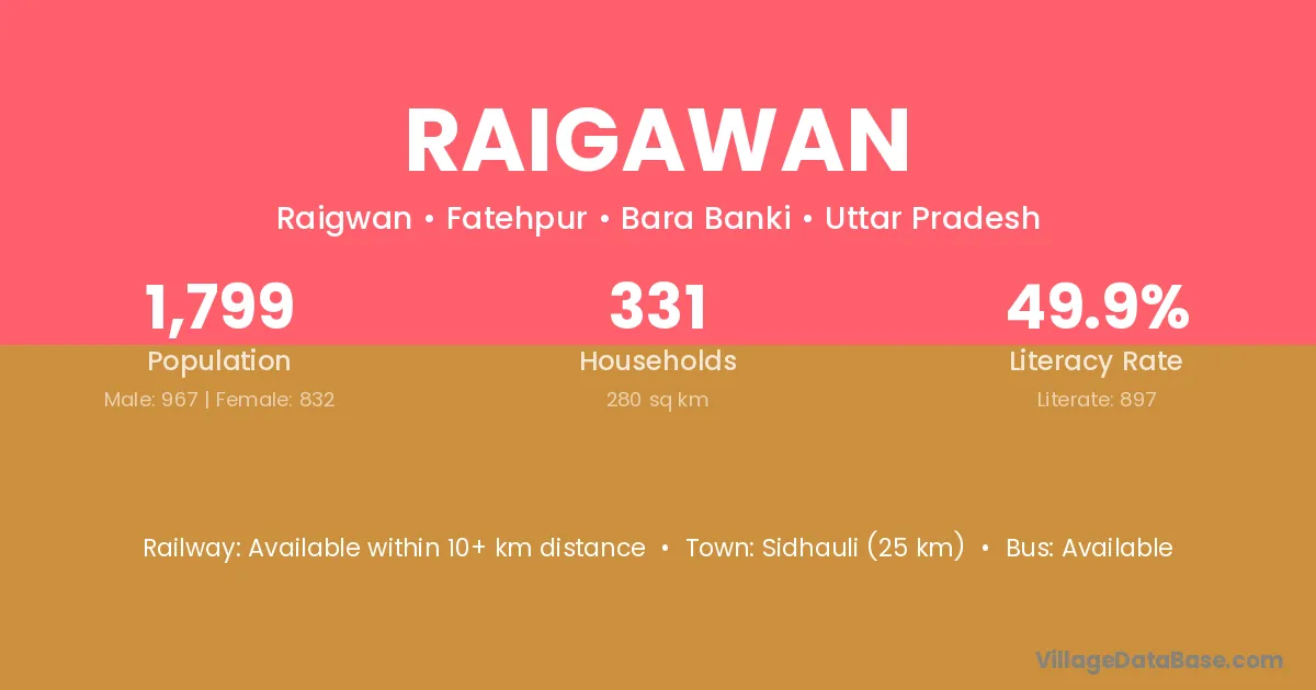 Raigawan village has a total population of 2,031 people, of which 1,065 are males and 966 are females.