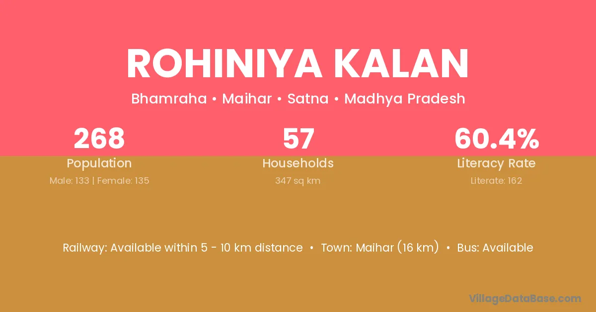 Maihar (16 km) is the nearest town to Rohiniya Kalan village for major economic activities and is located approximately 16 km away.