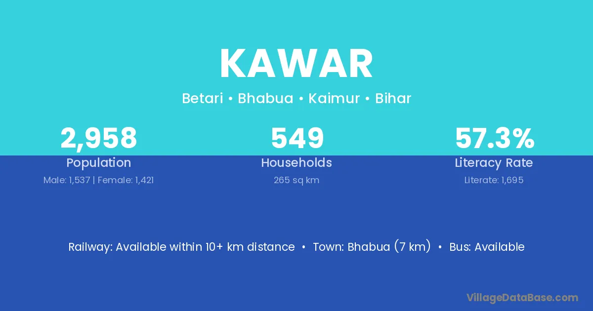 Kothi (11 km) is the nearest town to Kawar village for major economic activities and is located approximately 11 km away.