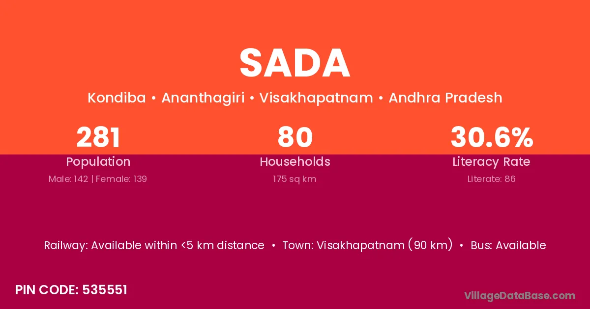 The literacy rate of Sada village is 61.10%. Male literacy stands at 66.67% and female literacy at 55.74%.