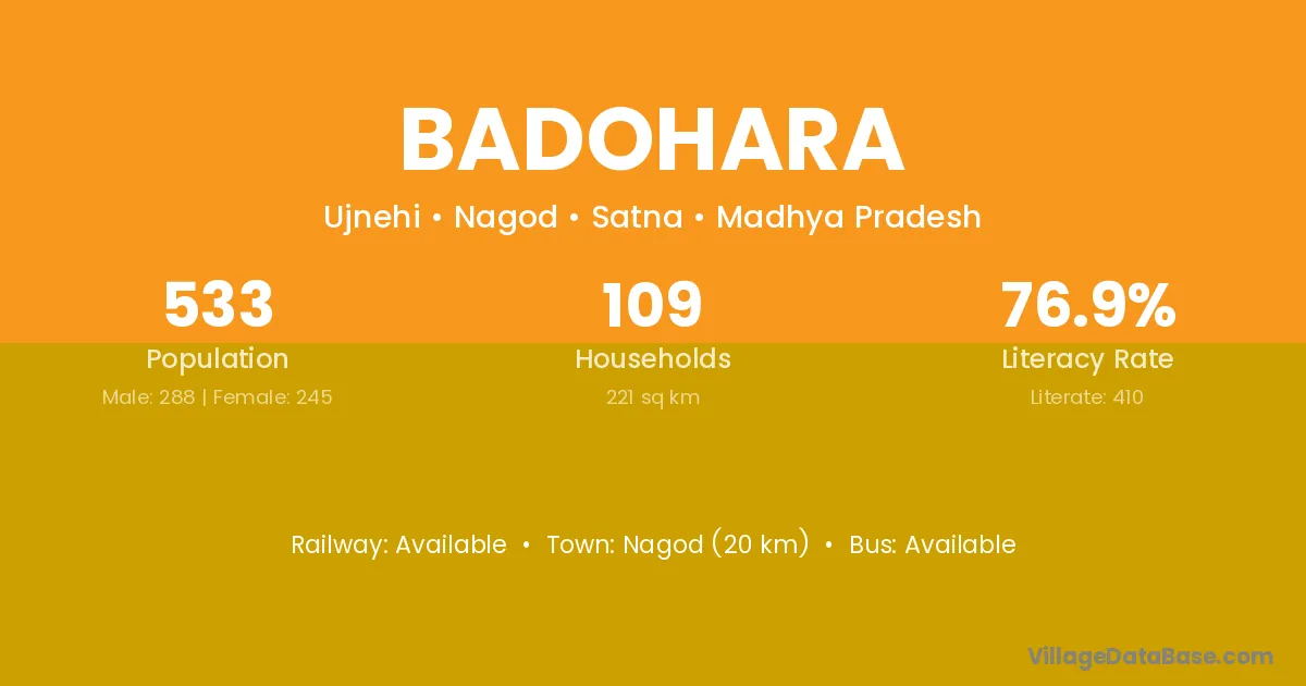 Nagod (20 km) is the nearest town to Badohara village for major economic activities and is located approximately 20 km away.