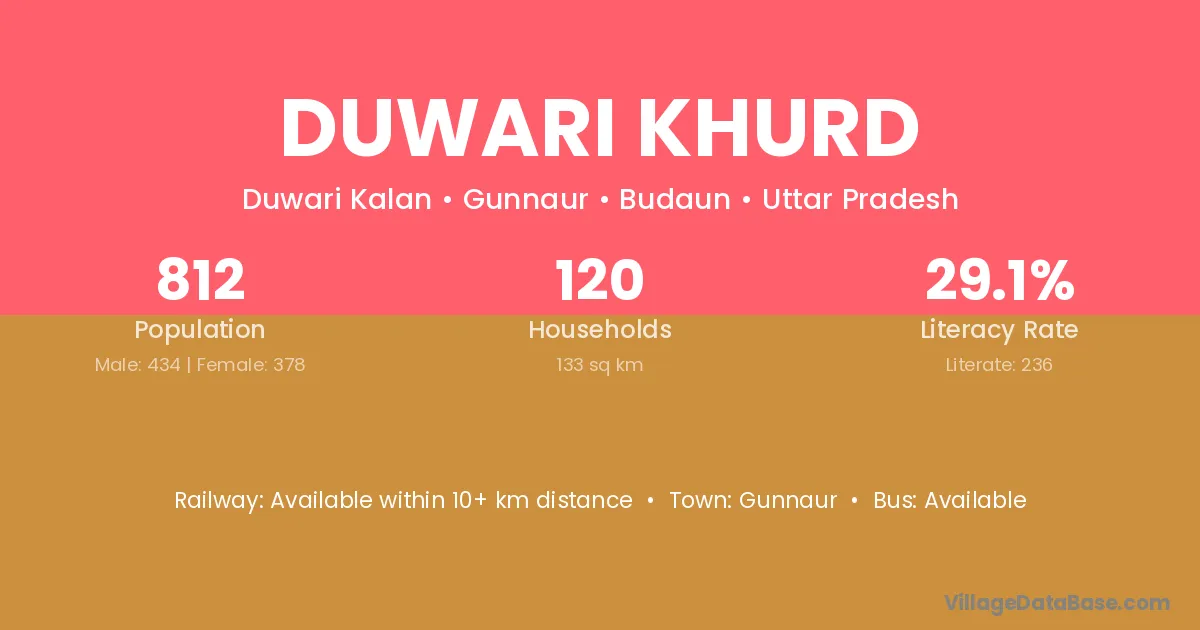 Duwari Khurd village has a total population of 449 people, of which 236 are males and 213 are females.