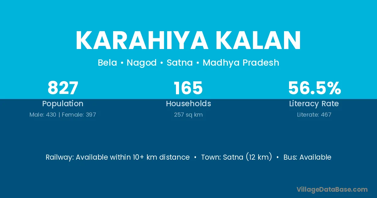 Satna (12 km) is the nearest town to Karahiya Kalan village for major economic activities and is located approximately 12 km away.