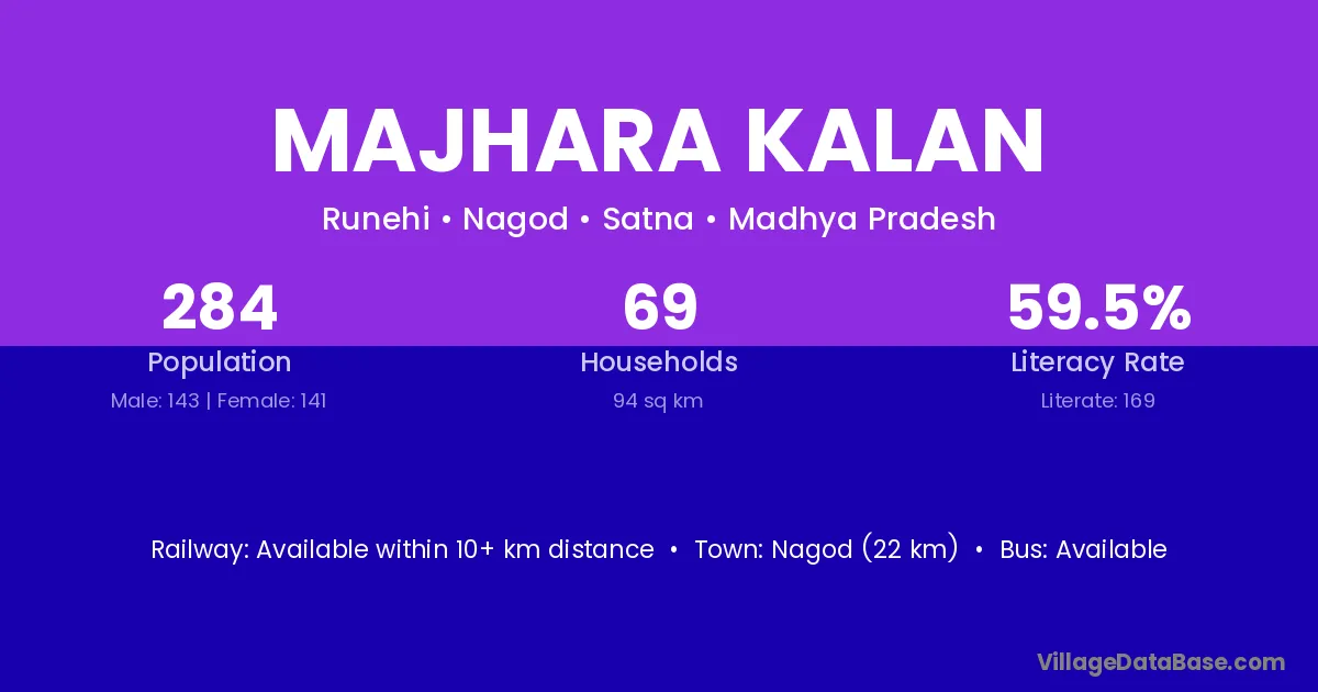 Nagod (22 km) is the nearest town to Majhara Kalan village for major economic activities and is located approximately 22 km away.