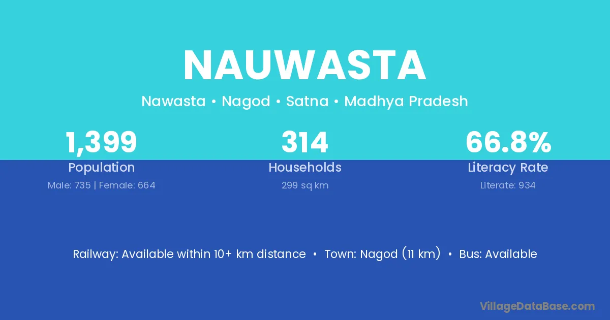 Nagod (11 km) is the nearest town to Nauwasta village for major economic activities and is located approximately 11 km away.