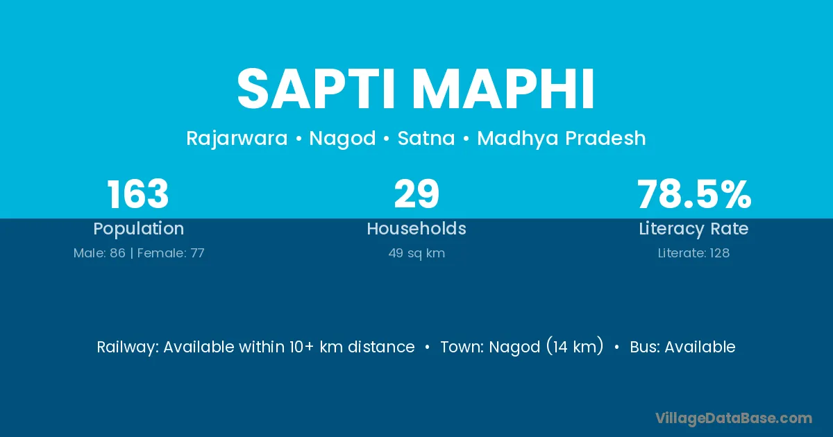 Nagod (14 km) is the nearest town to Sapti Maphi village for major economic activities and is located approximately 14 km away.