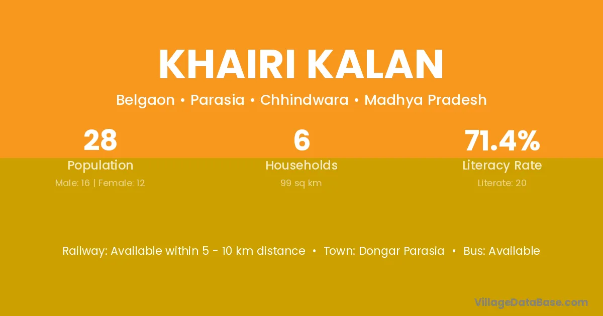 Satna (15 km) is the nearest town to Khairi Kalan village for major economic activities and is located approximately 15 km away.