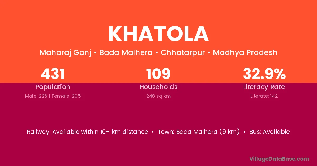 Kothi (3 km) is the nearest town to Khatola village for major economic activities and is located approximately 3 km away.